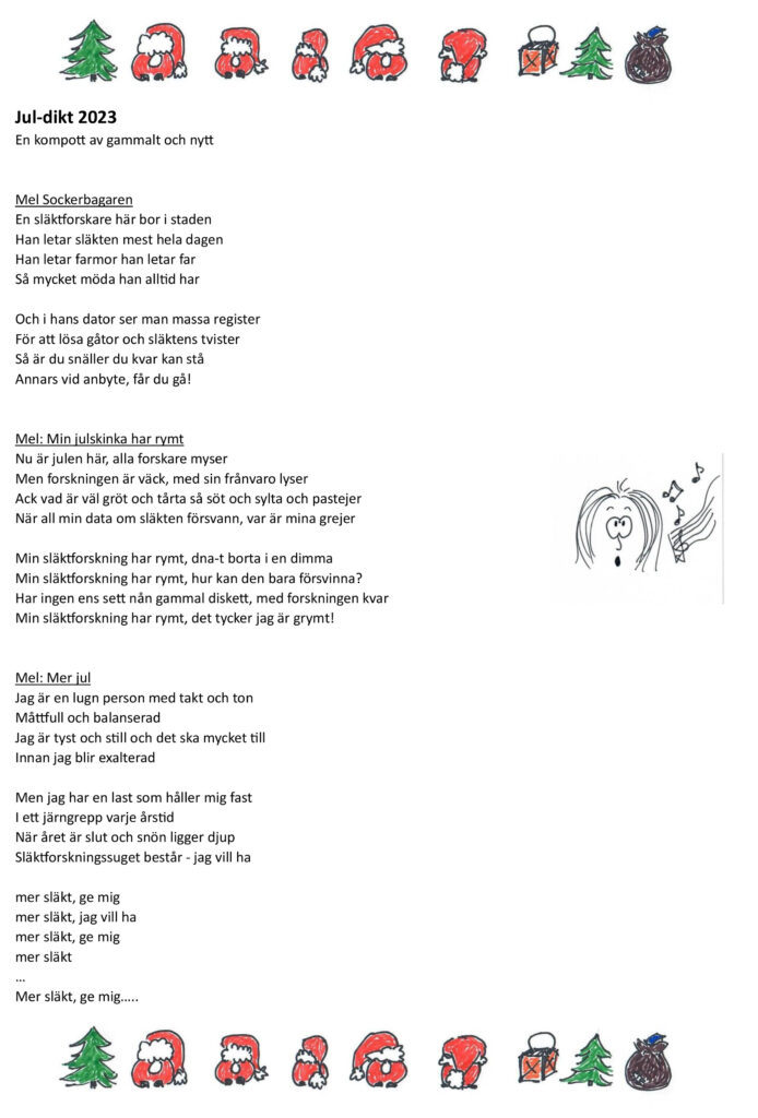 Släktforskaråret 2023 lider mot sitt slut och Hallands Släktforskarförening önskar er alla en riktigt GOD JUL och ETT GOTT NYTT ÅR med några specialkomponerade sånger av vår kanslist Gun Bergenfelz.