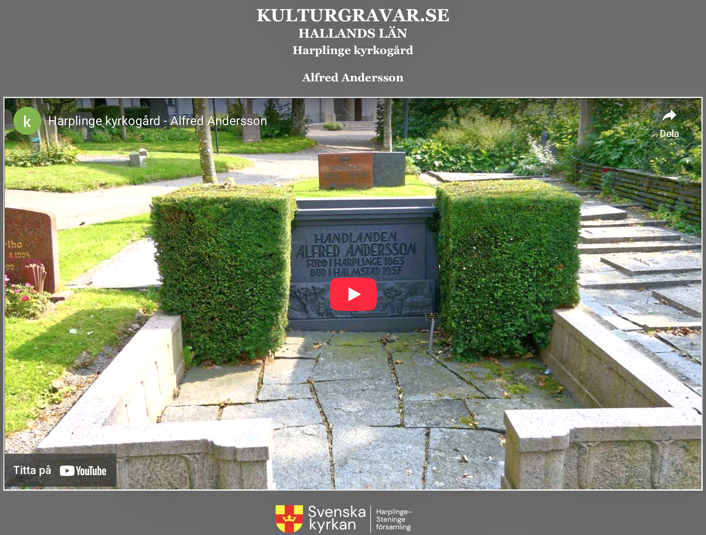 Svenska kyrkan har ett projekt om att presentera kulturgravar. www.kulturgravar.se . Man får höra en kort berättelse om graven, den gravsatte och några foton visas. I Halland finns just nu 31 kyrkogårdar som finns med i detta projekt och många av gravarna som presenteras där, är inventerade och återfinns i Gravstensinventeringen.