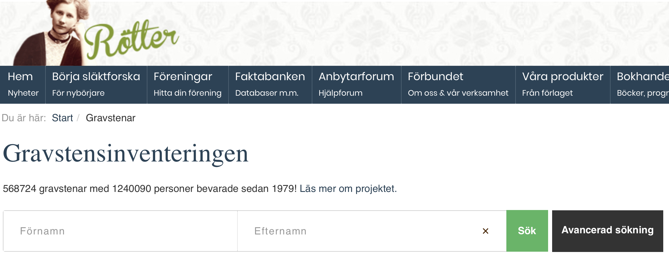 www.rotter.se/gsi – direkt till Gravstensinventeringen, Släktforskarförbundet