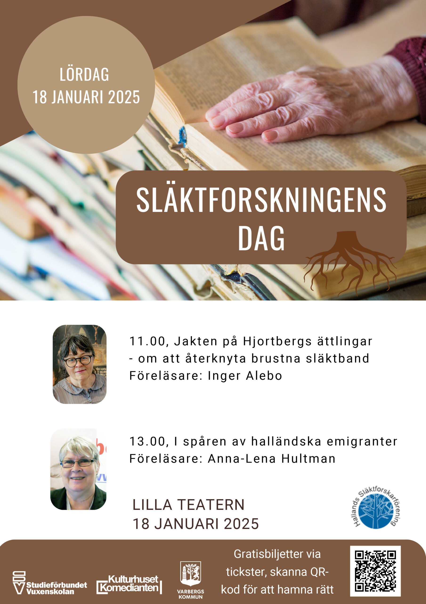 Jakten på Hjortbergs ättlingar – om att återknyta brustna släktband. FöreläsareInger Alebo PlatsKulturhuset Komedianten, Lilla Teatern Varberg DatumLördag 18 januari Tid11.00 KostnadGratisbiljetter via tickster, skanna QR-kod för att hamna rätt… Läs mer
